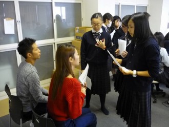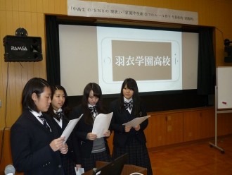 昨年、大阪府南部の公立中学校の研修会に、本校ボランティア部の高校生4名(3年生)がお招きを受け、「賢くスマートにネットを使おう」をテーマに発表を行いました。