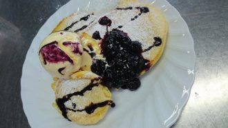 高校家庭部の活動報告です。写真は10月中ごろに挑戦したパンケーキ ブルーベリーソース添えの調理の様子です。