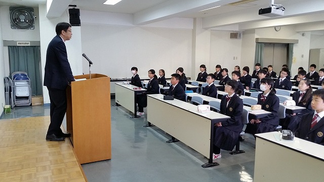 馬場校長先生の挨拶の後、生徒代表の宮口さん、内間君、赤間さん、白神さんが生徒を代表して、 校外学習に臨む決意を堂々と述べてくれました。
