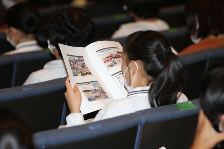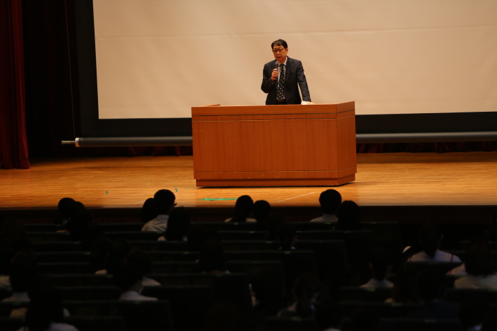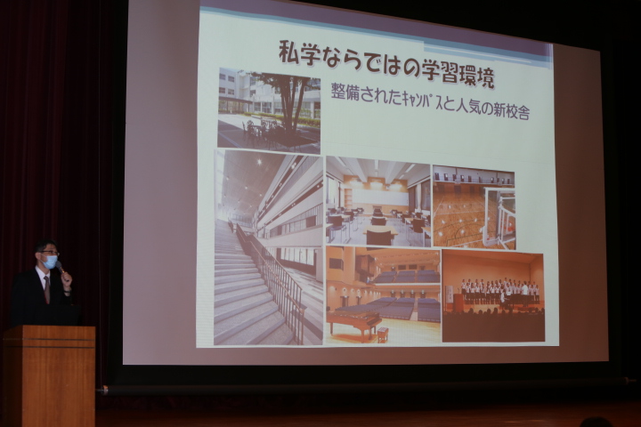 馬場校長の挨拶に続き、学校説明を行いました。生徒の皆さんの活躍の様子や学校の様々な教育活動、コースや入試の説明などをおこないました。