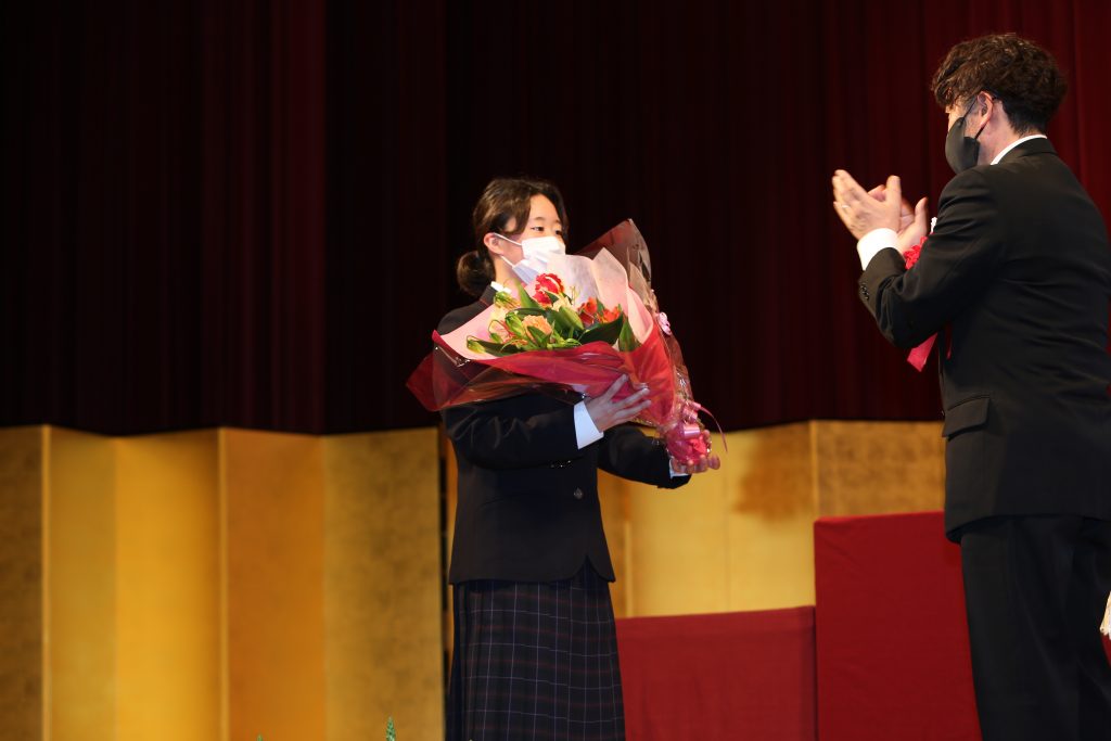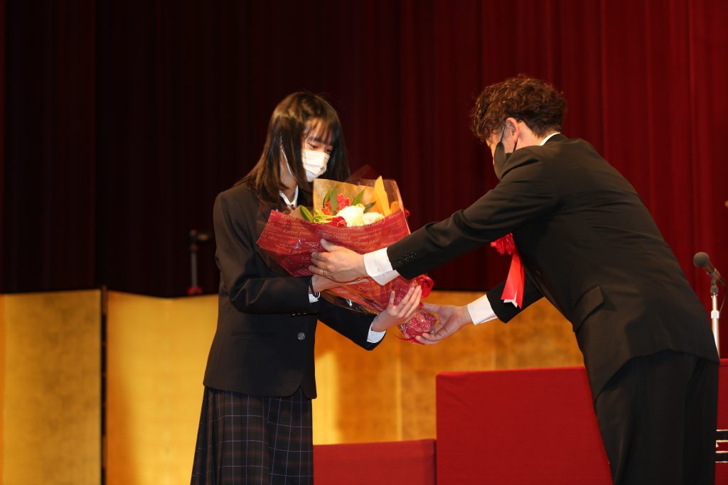 PTA会長北山様から、第一部は新入生の鎌田さん、第二部は香川さんに花束が贈られました。最後に、寛島 様、大神 様から、それぞれ新入生保護者代表のご挨拶をいただきました。誠にありがとうございました。
