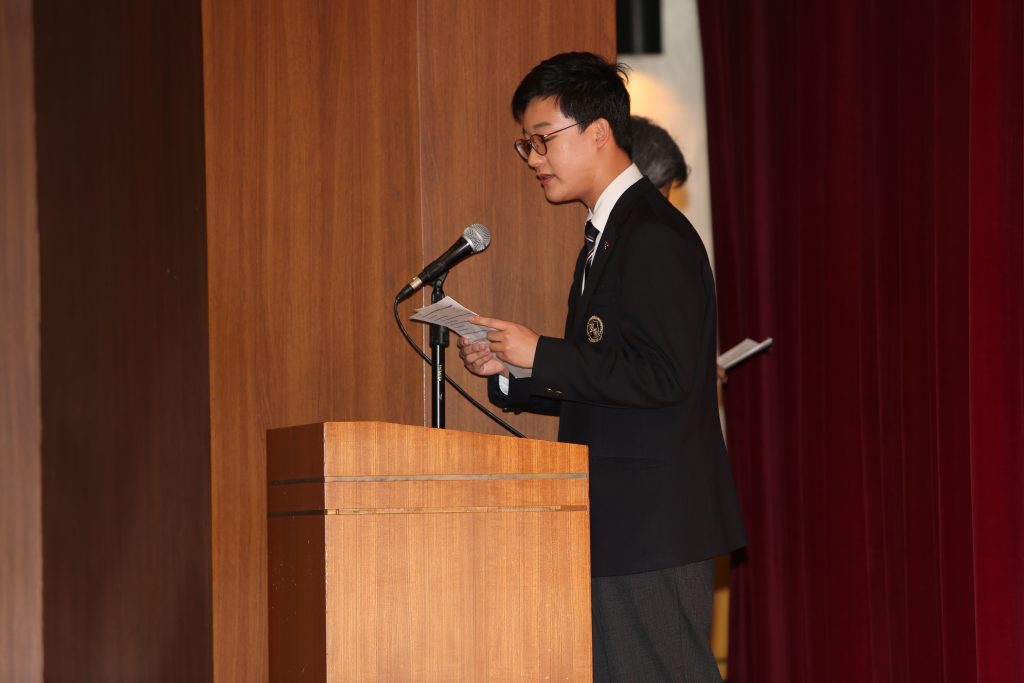 姉妹校の台湾・高雄高級職業学校からの英文メッセージを2年生の林君が、英語と日本語で紹介してくれました。