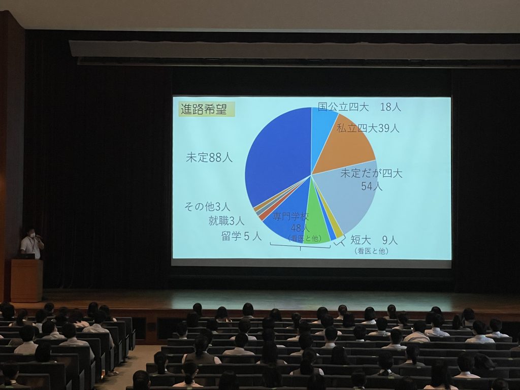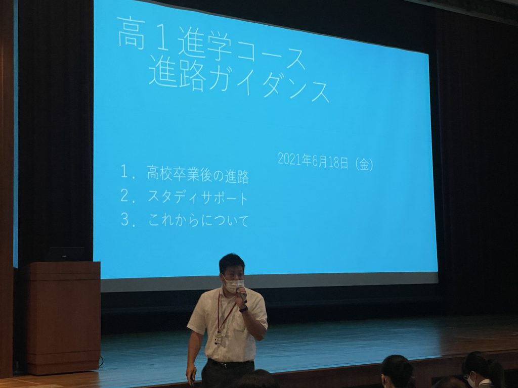 さて、先月になりますが、講堂にて高1進学コース進路ガイダンスを行いました。高校生活がはじまって2か月余り。期末考査も終わり、これから進路をじっくりと考えはじめる時期になってきました。