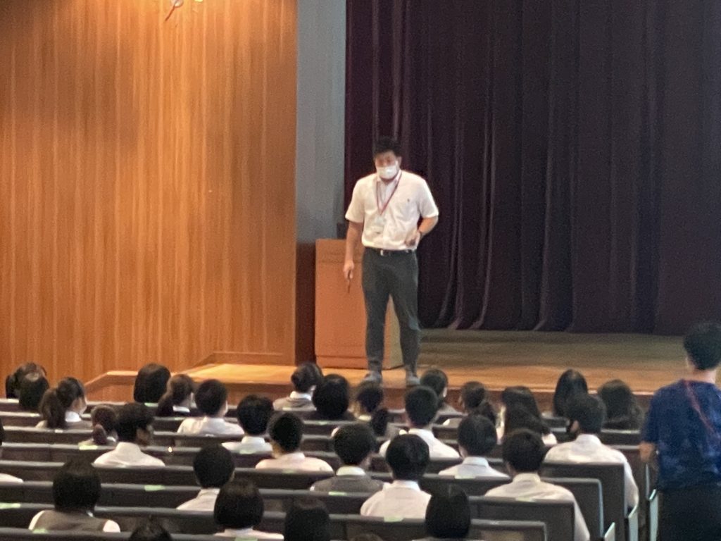 集会の最後には教育実習生が登壇し、進路決定についての自身の経験を語ってくれました。生徒との年齢が近い分、現実味のあるお話は非常に参考になったようでした。