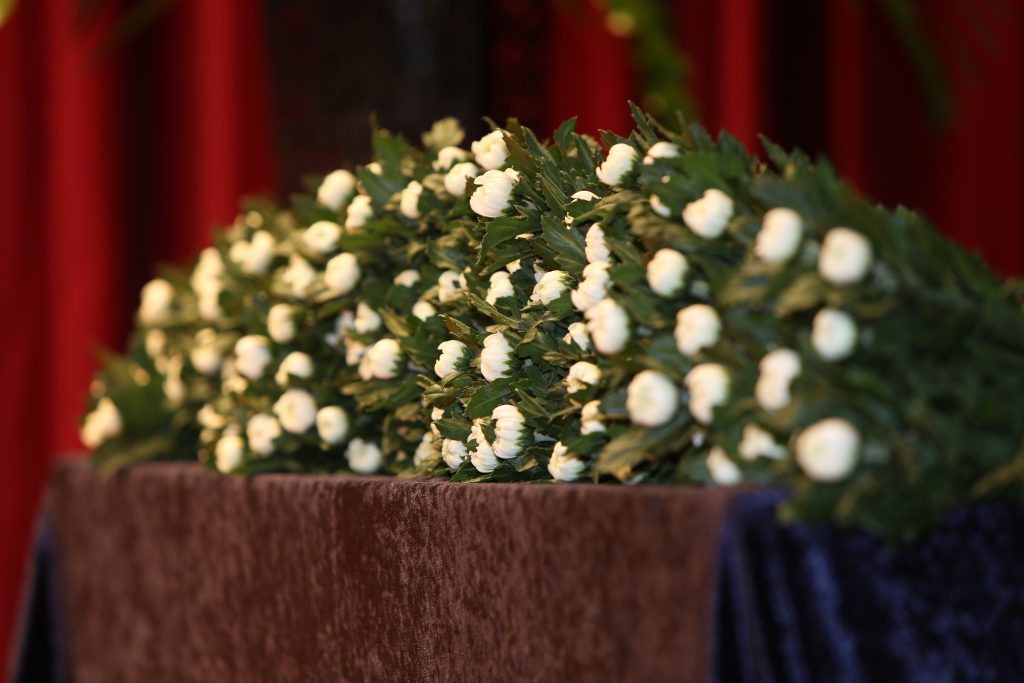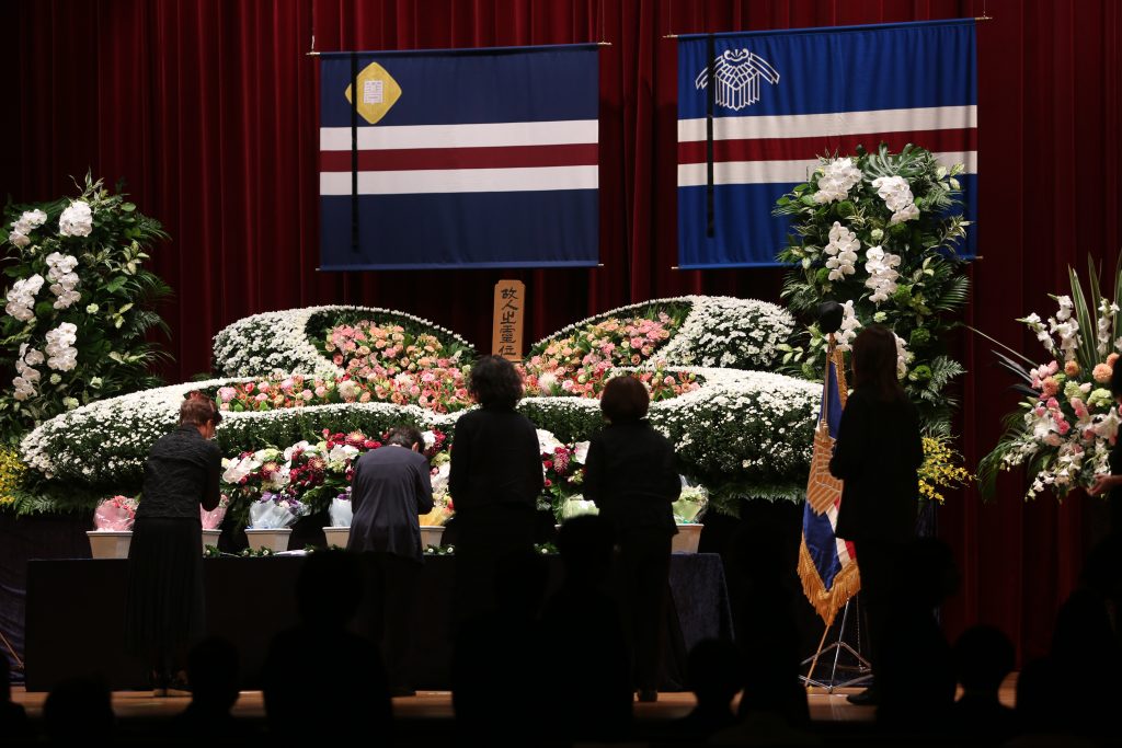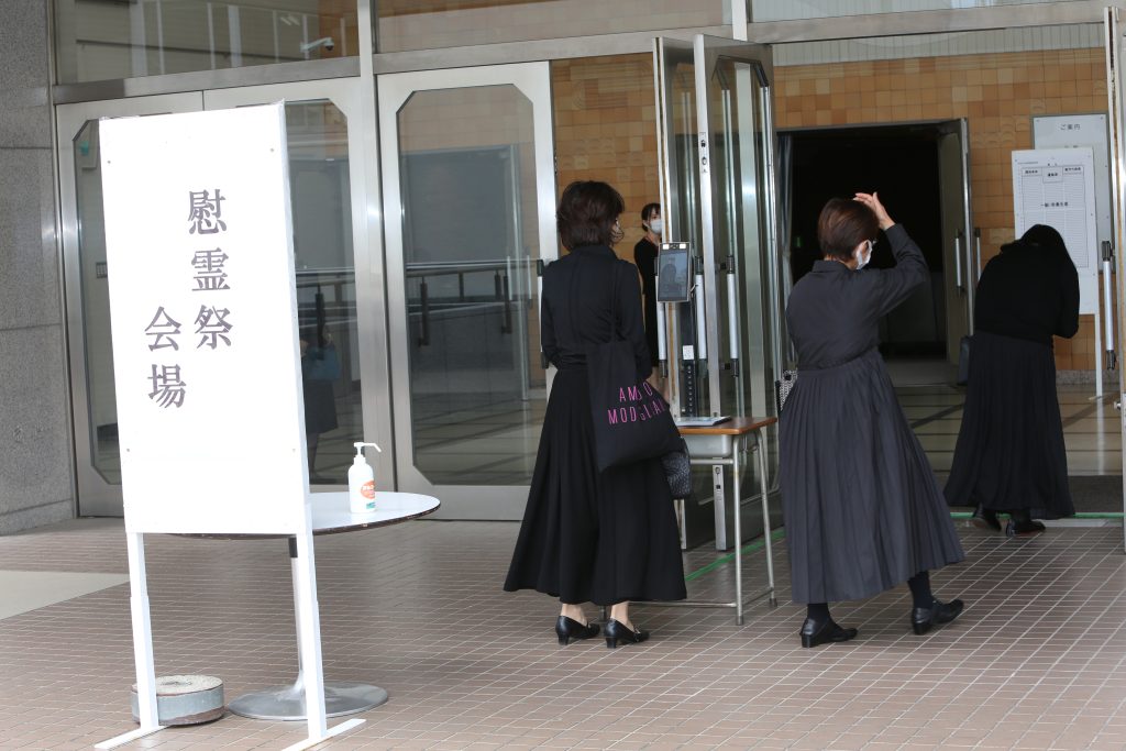 放送部の生徒たちが司会を担当。校歌を清聴したあと、代表教職員・生徒・学生が拝礼をおこないました。続いて、故人のお名前とともに、慰霊の言葉が中野校長より読み上げられました。その後、ご遺族をはじめ、参列された皆様が思いをこめて祭壇に献花されました。