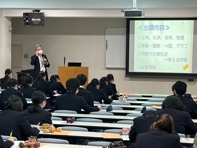 入試5教科の先生方から、入試に向けて押さえるべきポイントや、勉強方法、注意点などが詳しく話され、生徒たちは熱心にメモを取りながら聴いていました。