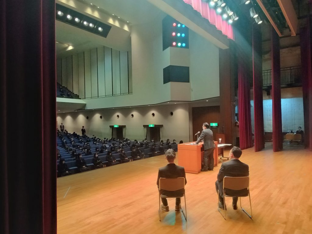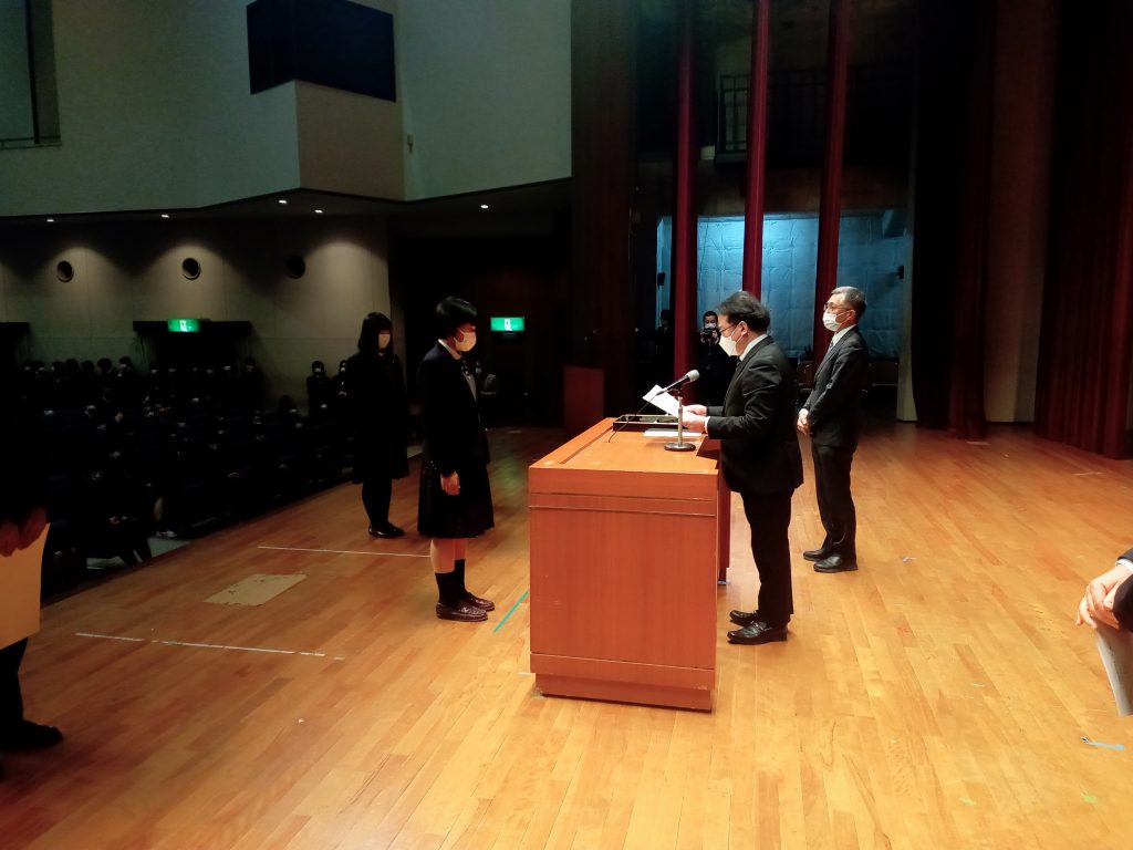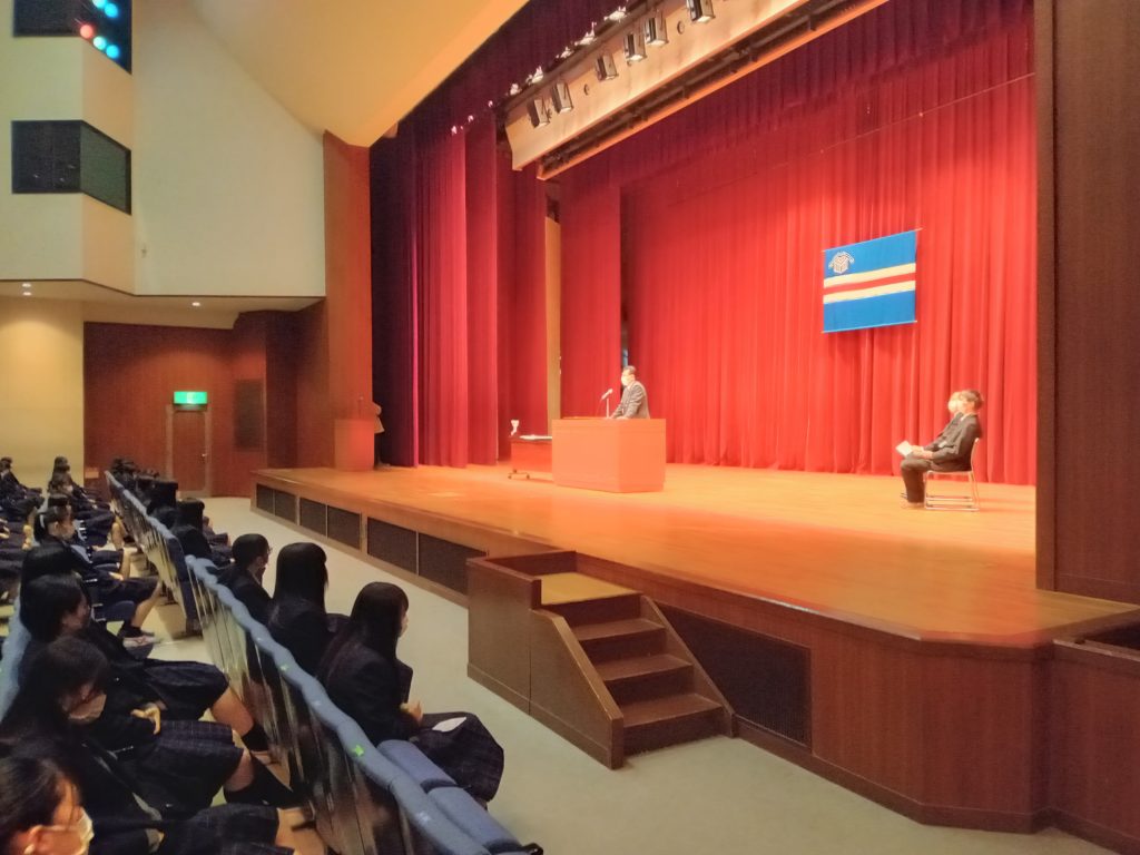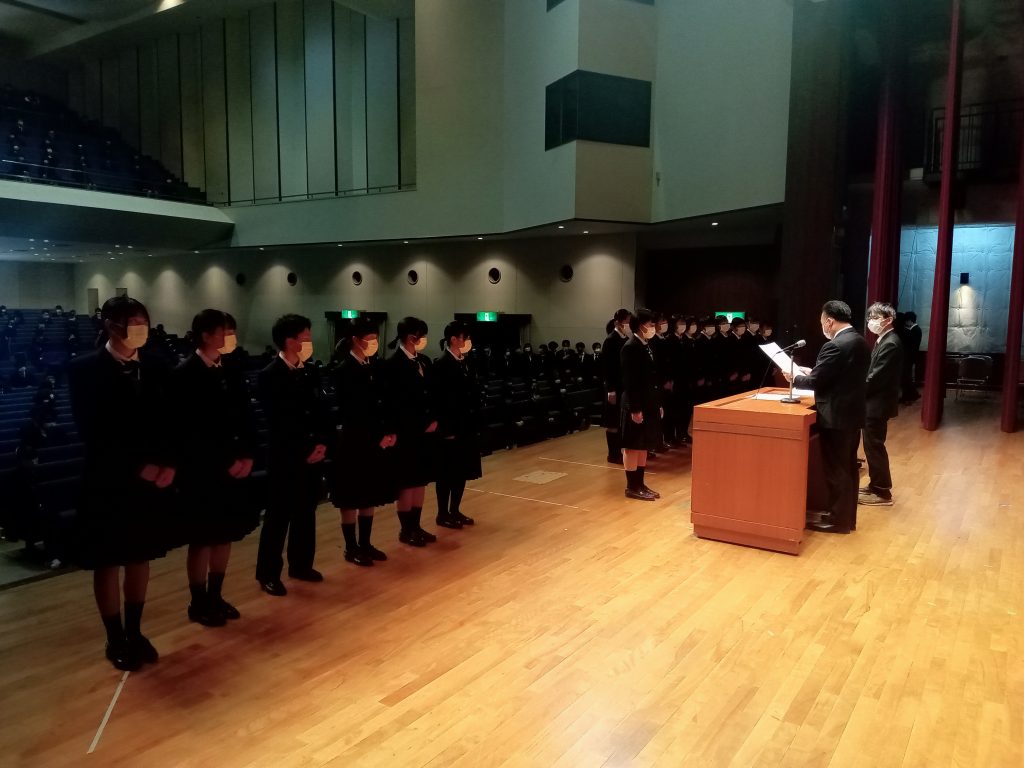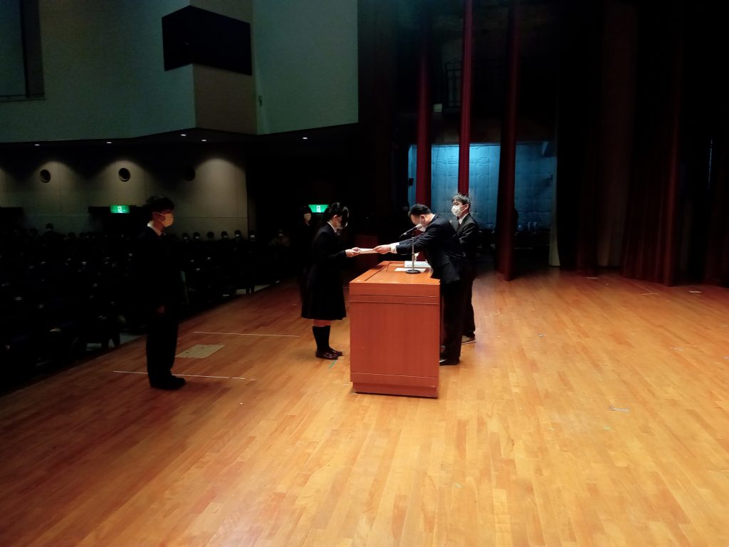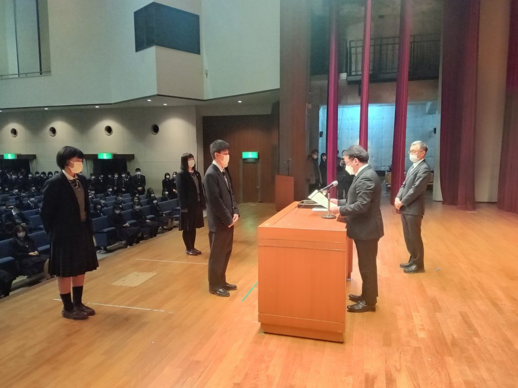 中野校長先生の式辞では、この2学期を振り返り、みんなの協力で、学園祭が成功したことについて触れられました。生徒の皆さんが感染対策などにも協力してくれたおかげで、模擬店も含めて無事感染拡大などを起こさず、実施できました。その点について、生徒の皆さんに感謝の言葉が述べられました。また、ワールドカップサッカーでの日本の奮闘について触れられ、最後まであきらめない姿勢に勇気をもらうとともに、その背景には海外で活躍する選手、大学を卒業した代表選手が増えたことなど、幅広い視点・広い視野で取り組む選手が増えたことも影響しているのではないかというお話がありました。