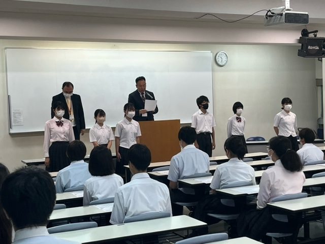 中学の式でも、校長先生の式辞、生徒指導・門井先生のお話、表彰では水泳部と、英検で2級・準2級・3級を取得した生徒たちが表彰されました。