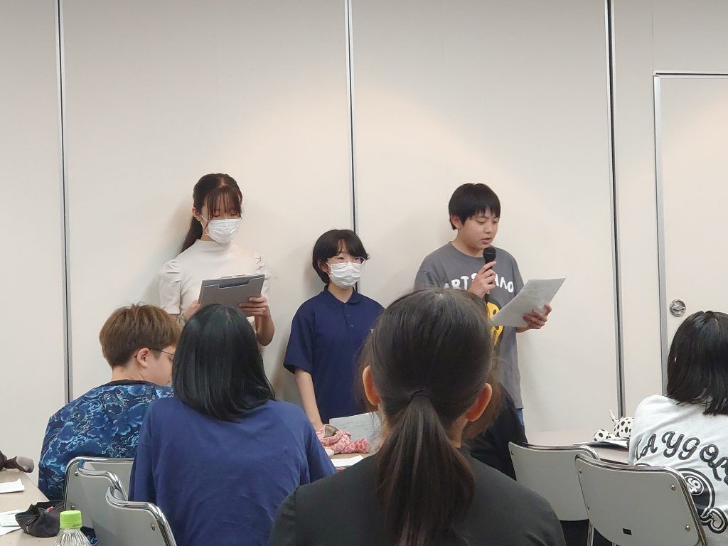 午後からは、午前中に行ったプログラムのふり返りです。「今から取り組めること」と「社会人になった時、市役所、関西空港(企業)、漁師の立場で取り組めること」について考え、発表しました。