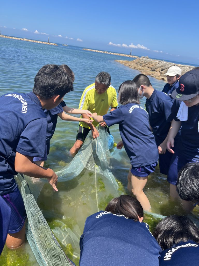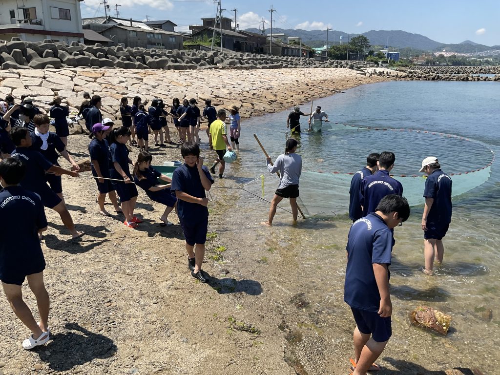 「大阪湾の海の森(藻場)保全・再生プロジェクト」についてご講演いただきました。最初に、阪南市役所の方から「SDGsやブルーカーボン、市の海洋教育について」、次に関西エアポート株式会社さんから「関西空港の成り立ちから空港島に育つ海藻や海の環境を守る活動について」、最後に株式会社漁師鮮度の方から「大阪湾の移り変わりや大阪湾の環境について」のお話を聞きました。その後地引き網をし、生物の観察と獲れた魚について説明を聞きました。