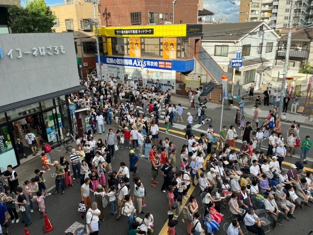 このイベントは、高石商工会議所を中心に、羽衣及び東羽衣校区の自治会や各種団体等、地域住民のみなさんが連携して、手作り型のまつりを実施するというものです。フリーマーケットのお店が多く出展し、歩行者天国となった駅前通りは多くの人がつめかけ、猛暑の中でしたが、たいへんな賑わいを見せていました!