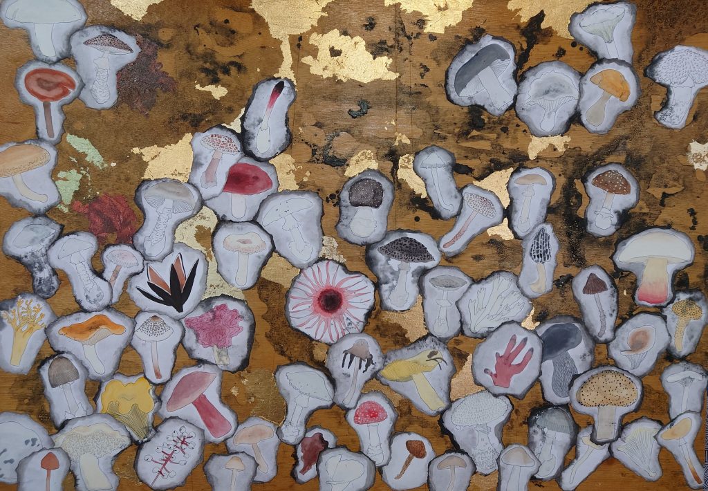 <奨励賞イラスト部門>3年・荒木さん「毒キノコ」(水彩・墨汁・金箔)