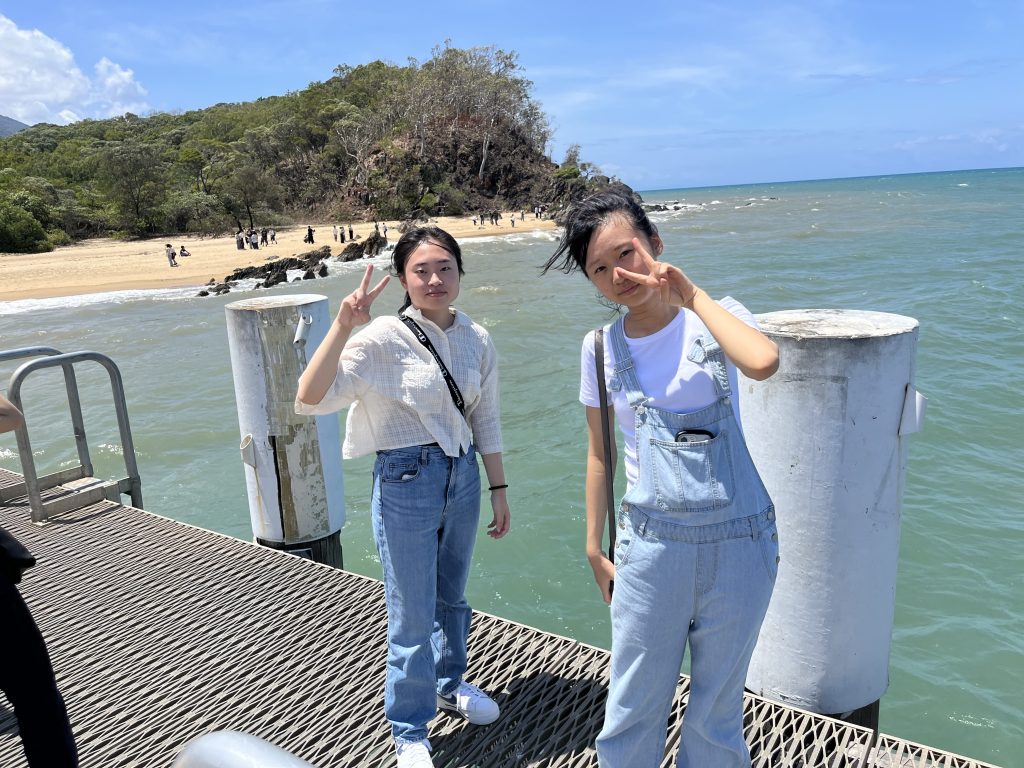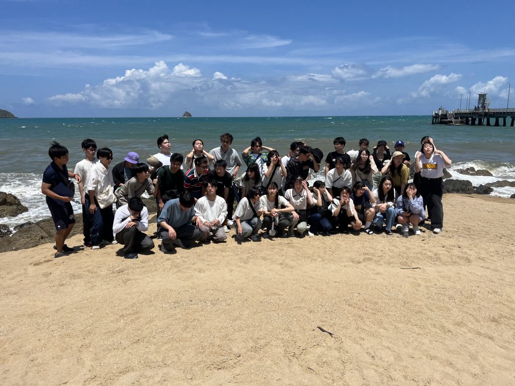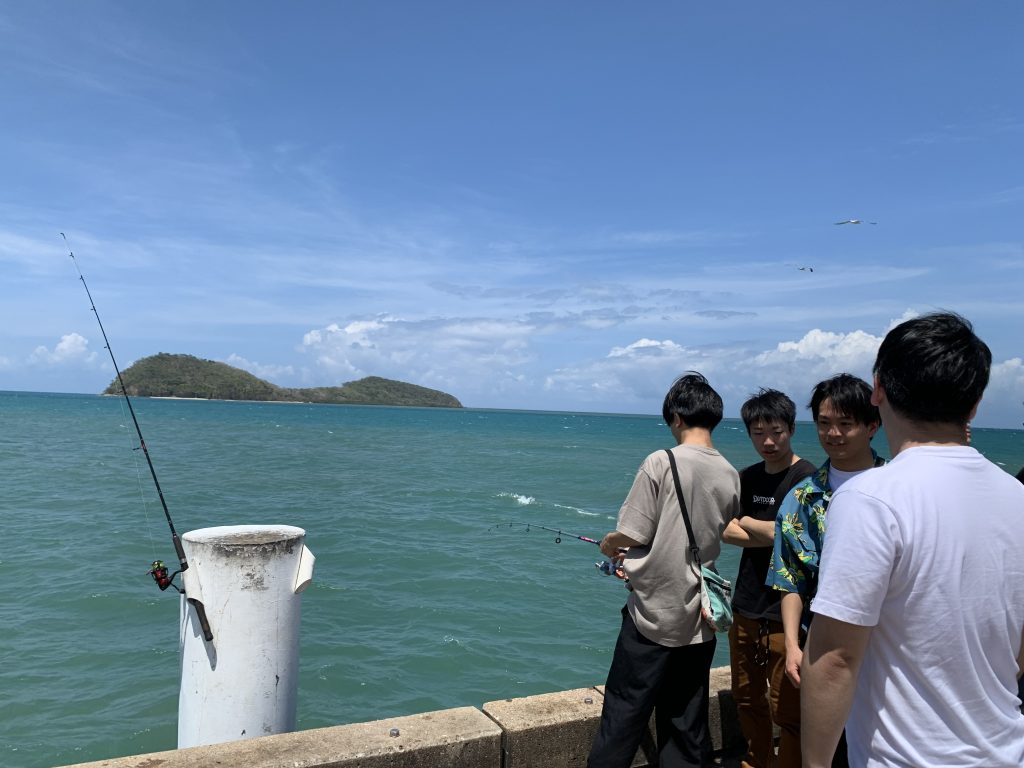 リゾート地の美しいビーチで集合写真です。また、ここでの自由時間に海に突き出た堤防に行った男子生徒が、そこで魚釣りをしていた男性に声をかけて、なんとサビキ釣りをさせてもらえることになって、背の青い鯵のような魚をつっていました。