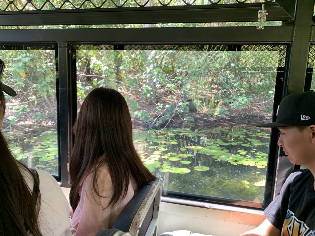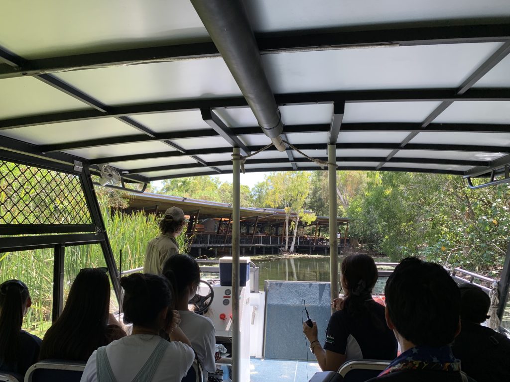 ワニの飼育のために自然の中に作られた池に、ボートに乗って出ていきます。