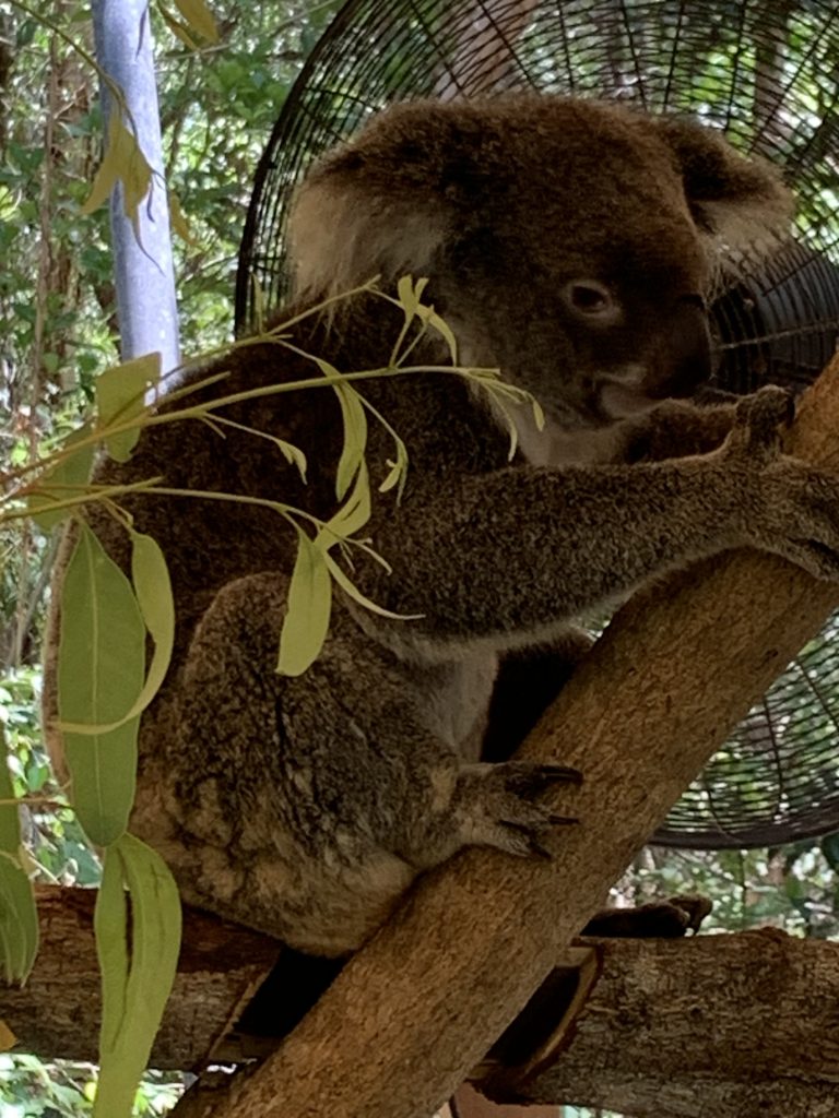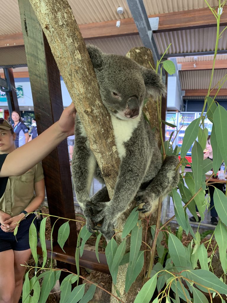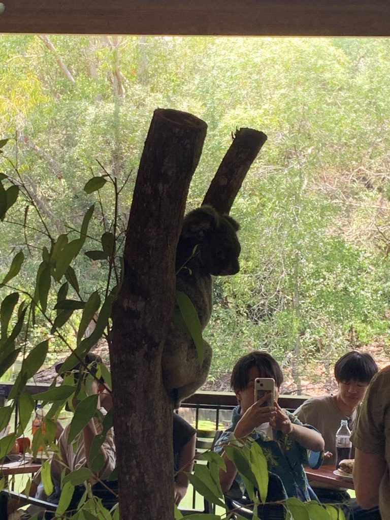 昼食会場に、コアラがやってきました。コアラはたいへん神経質な動物で、このように写真撮影のために飼育員以外のお店の前に出るのは、1日に30分まで。また、抱っこしてもいいコアラ、腰からしたなら触ってもいいコアラなどが決まっているそうです。この子は抱っこはダメですが腰あたりを撫でてあげることは可。写真も撮り放題でした^_^