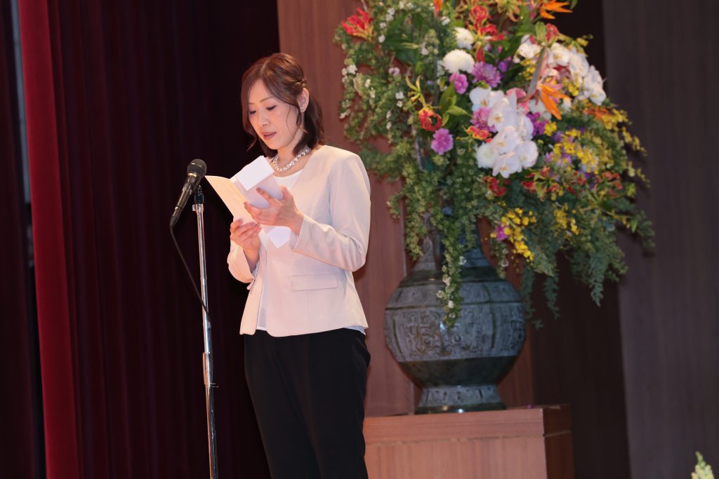 続いて、ご来賓の畑中高石市長様より祝辞を頂戴しました。ご自身の経験をもとに、いろいろな経験をし努力をしたことが今の自分にすべてつながること、今苦手なこともいつかチャレンジできるようになり、それが人生を豊かにするなど、アドバイスを頂きました。