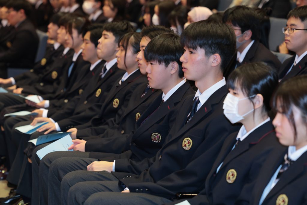 中野校長の式辞では、学園創立の歴史、校旗や校章の由来などについて説明がありました。また、学校に通えることや普段の日常生活が送れることは当たり前ではなく、感謝の気持ち忘れないようにという言葉が贈られました。