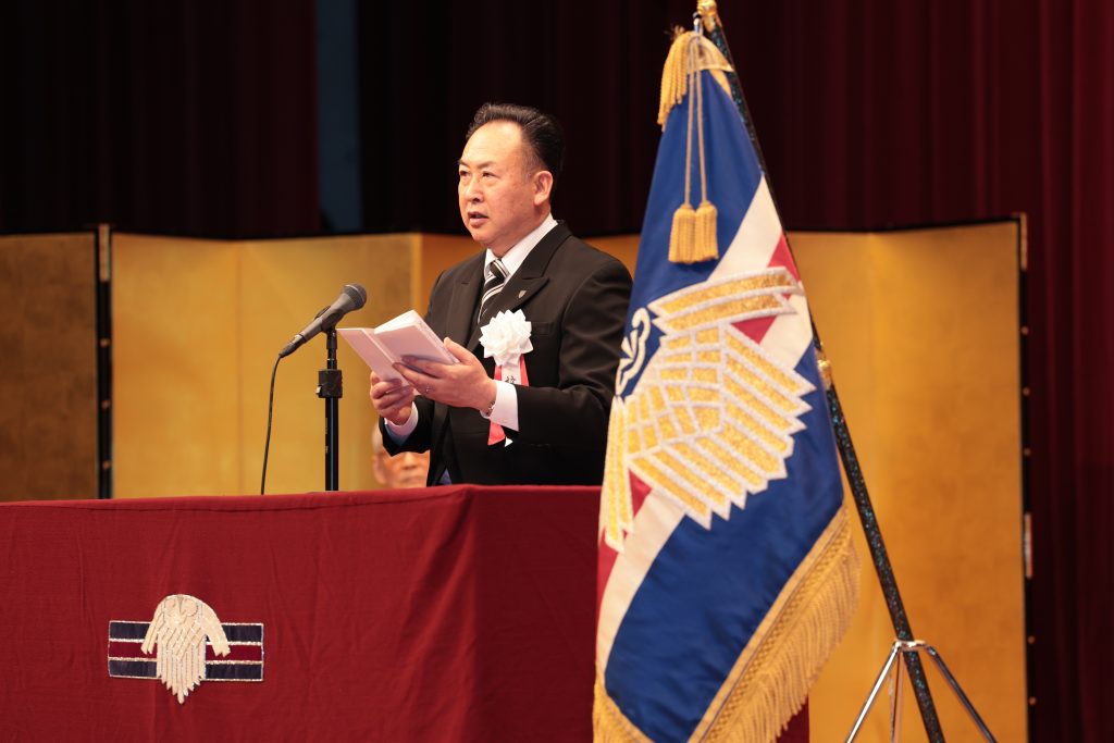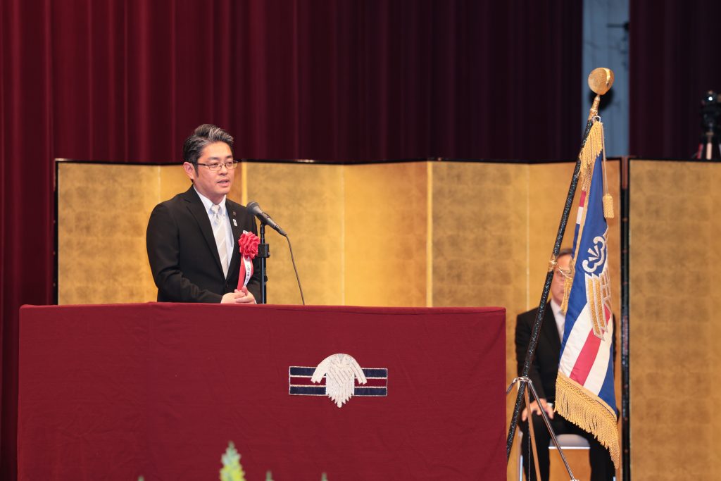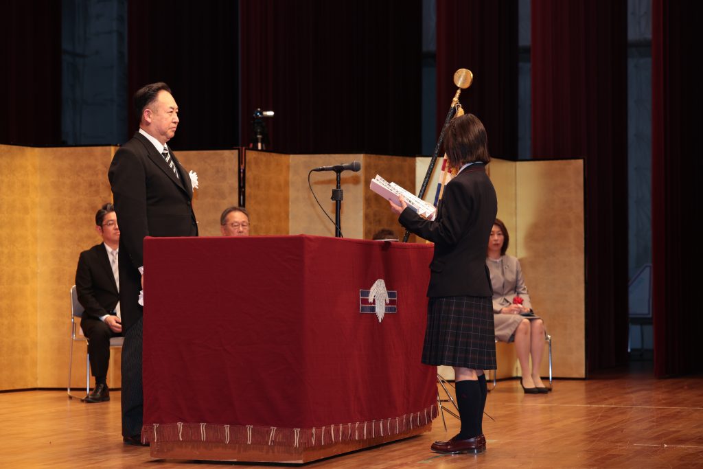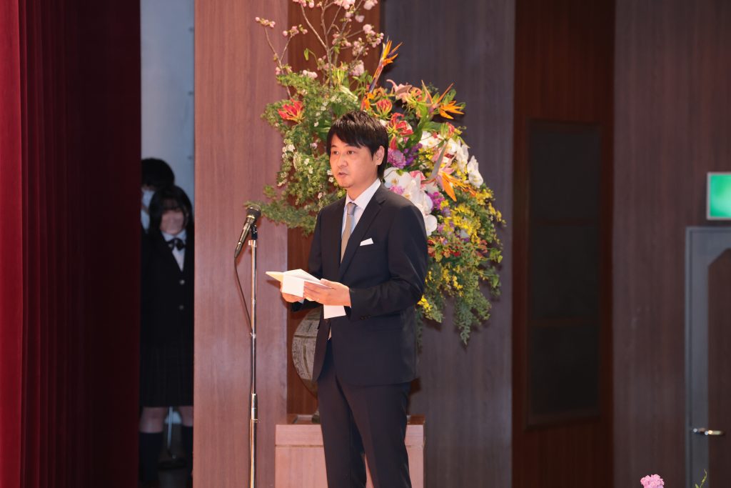 続いて祝辞を畑中高石市長様より頂きました。お話の中で、「原点」の大切さ、「自治」という意味について触れられ、これからの学校生活の中で、自分がみんなのために何ができるかを考え続けることが成長につながるというメッセージを頂きました。