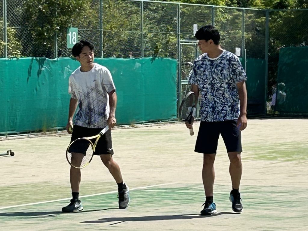 ダブルスから始まり、序盤はミスが重なり、厳しいスタートでしたが、徐々に相手に追いつき、7-5で勝利。