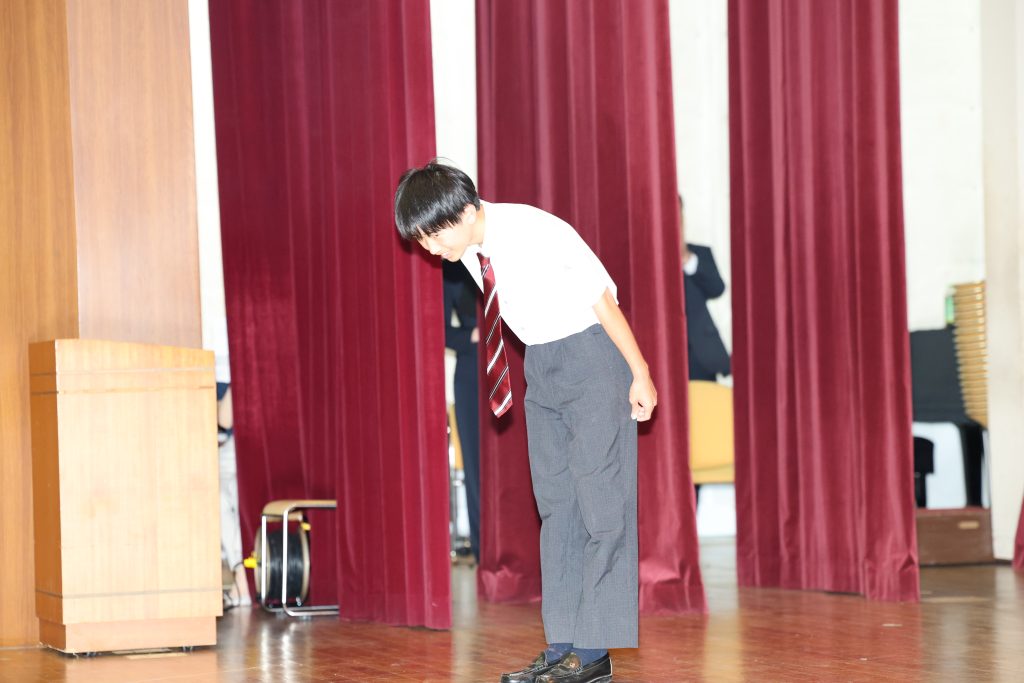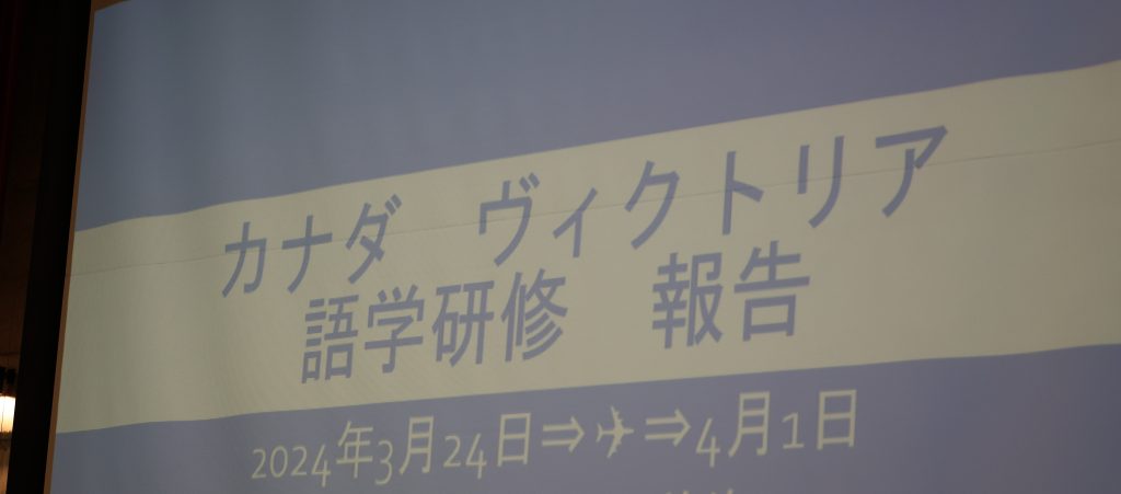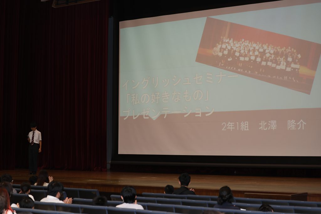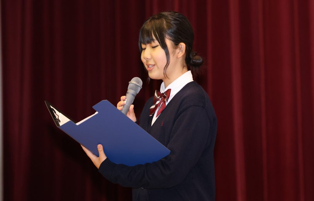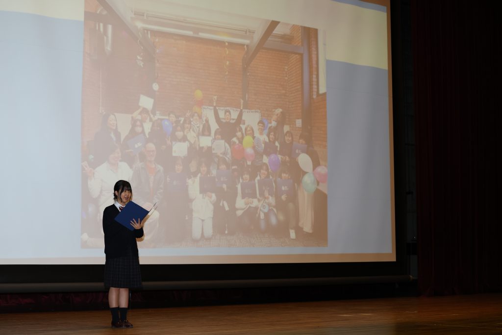 参加者の皆様には最初に講堂に集まっていただき、中野校長のあいさつの後、在校生を代表して2年生の北澤さんによる英語のスピーチと、本校でカナダ・ヴィクトリア語学研修に参加した2年生の岸本さんのプレゼンテーションをお聴きいただきました!