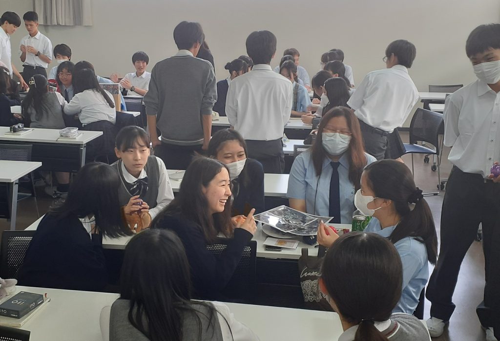 新しくなった特別棟のレクチャールームで、台湾と日本の2校の生徒たちが、英語や日本語中国語交じりの会話をしながら、楽しく過ごしました。また、それぞれが用意したプレゼントの交換をして、校内の案内も行いました。
