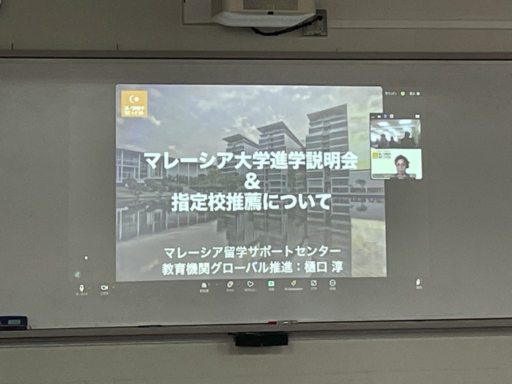 次に、オンラインで、「マレーシア留学サポートセンター」の樋口様より、マレーシアの大学『テイラーズ大学』との指定校協定とマレーシアの大学の話などを伺いました。