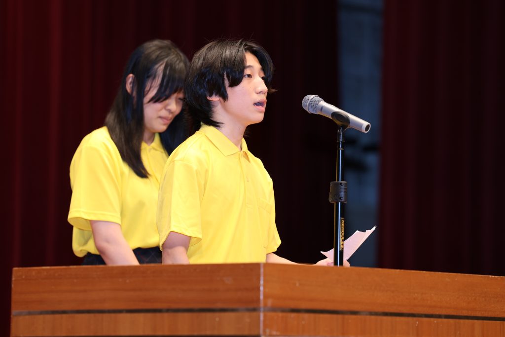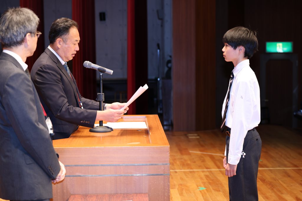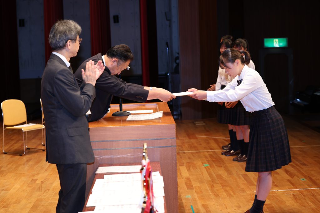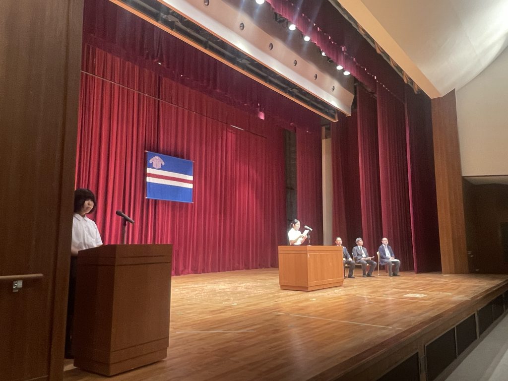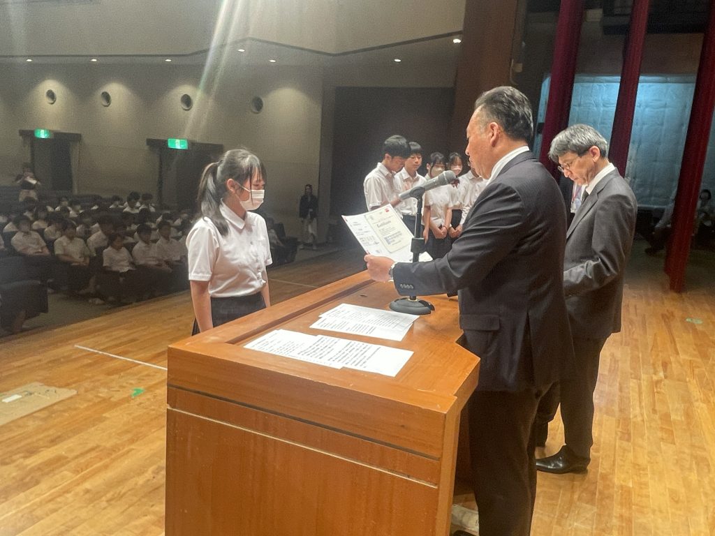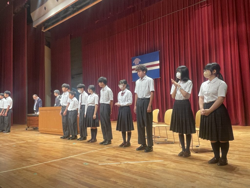 中学の部では、校長先生の式辞、生徒指導の井上先生からの夏休みの注意、自治会会長の長嶺さんからのお話などがありました。表彰では、中2で2級に合格した林さんをはじめ、準2級・3級に合格した生徒の皆さん、漢字検定で優秀な成績をあげた皆さんが表彰されました!