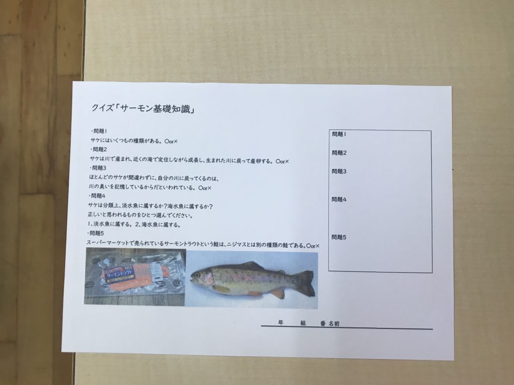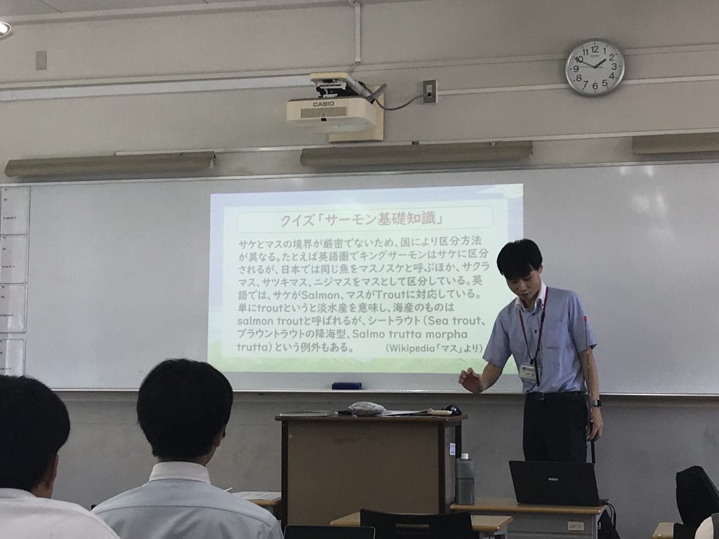 クイズやペアワークも盛り込みながら、サケの種類にはじまり、誕生から川の遡上に至るまでのサケの一生をたどる内容となっており、生徒たちは口にすることもある「サケ」という魚の知らない一面にも触れることができ、新たな発見を得ていました。