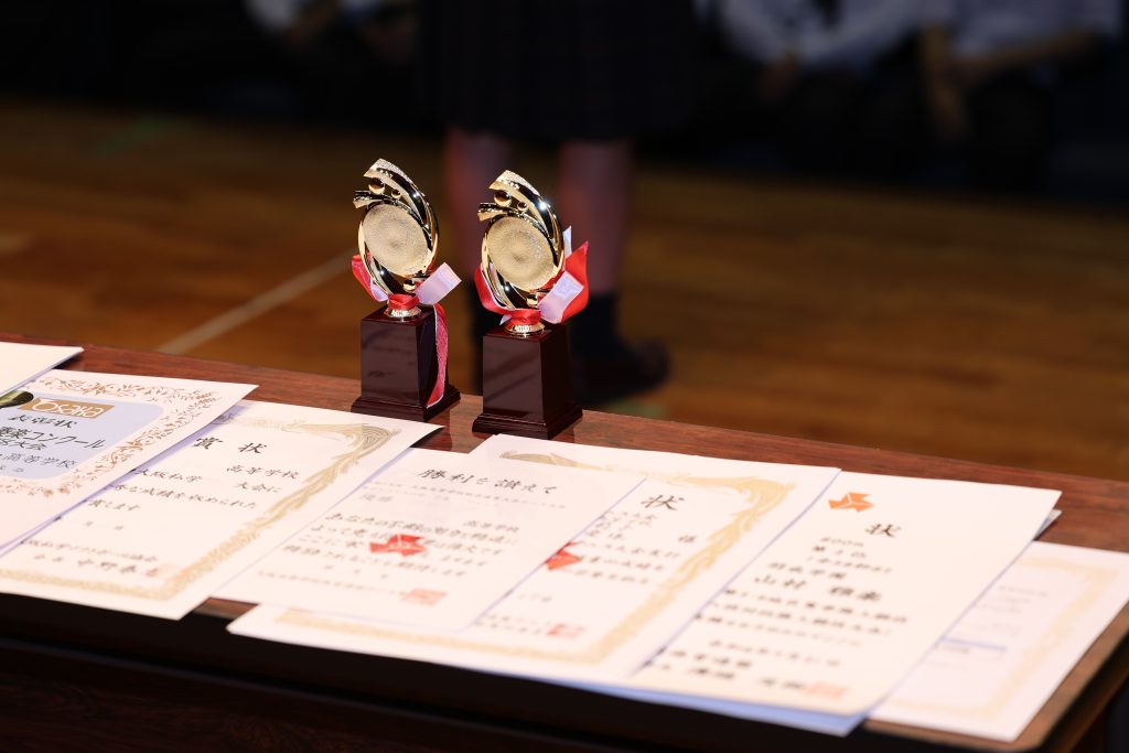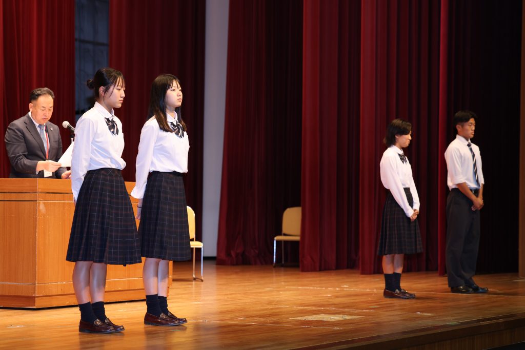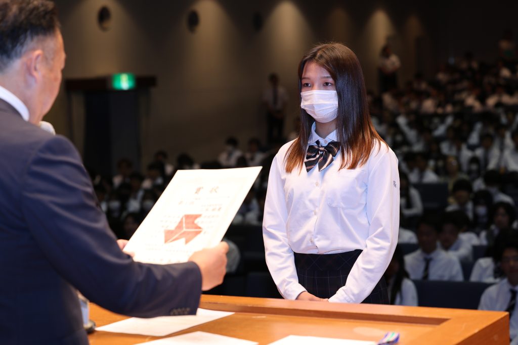 表彰では、インターハイ・女子ボクシング競技で優勝した高2・三木さんの表彰が最初にありました。続いてインターハイに出場し、現在U18日本代表に選出されている高3吉岡さん、新熊さんの紹介がありました。水泳部は男女そろって初となるインターハイに出場を決めました。当日は、ジュニアオリンピック出場で全員はそろいませんでしたが、代表生徒が表彰を受けました。そのほかにも、吹奏楽部の大阪府大会出場をはじめ、各クラブが日頃の成果を発揮して成果をこの夏に数多くあげ、表彰を受けました。