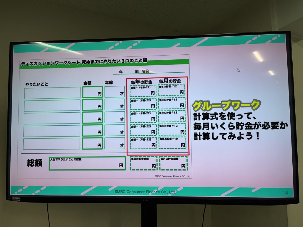 金融教室では、まず「死ぬまでにやりたいこと」をリストアップしたあと、その実現にお金がいくらかかるかをタブレットで調べ、どれほどの貯蓄が必要かなどを考えました。