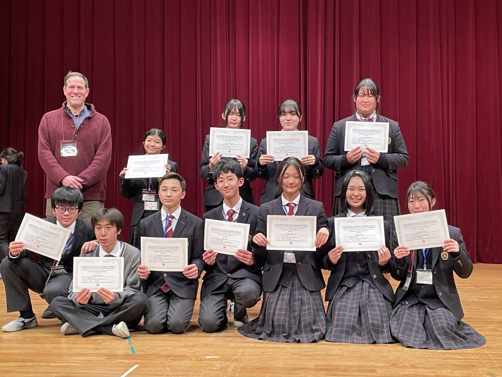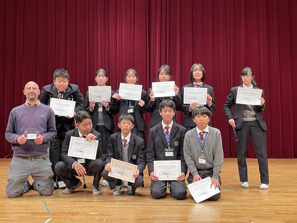 ちょっと緊張する場面ですが、生徒たちには「おてのもの」です。午後からたくさんの保護者が参観に来てくださいました。その中で全員が発表をして、各グループで2名ずつが講師によって選出されました。みんなが上手に発表したので、選ぶのに苦労しているようでした。