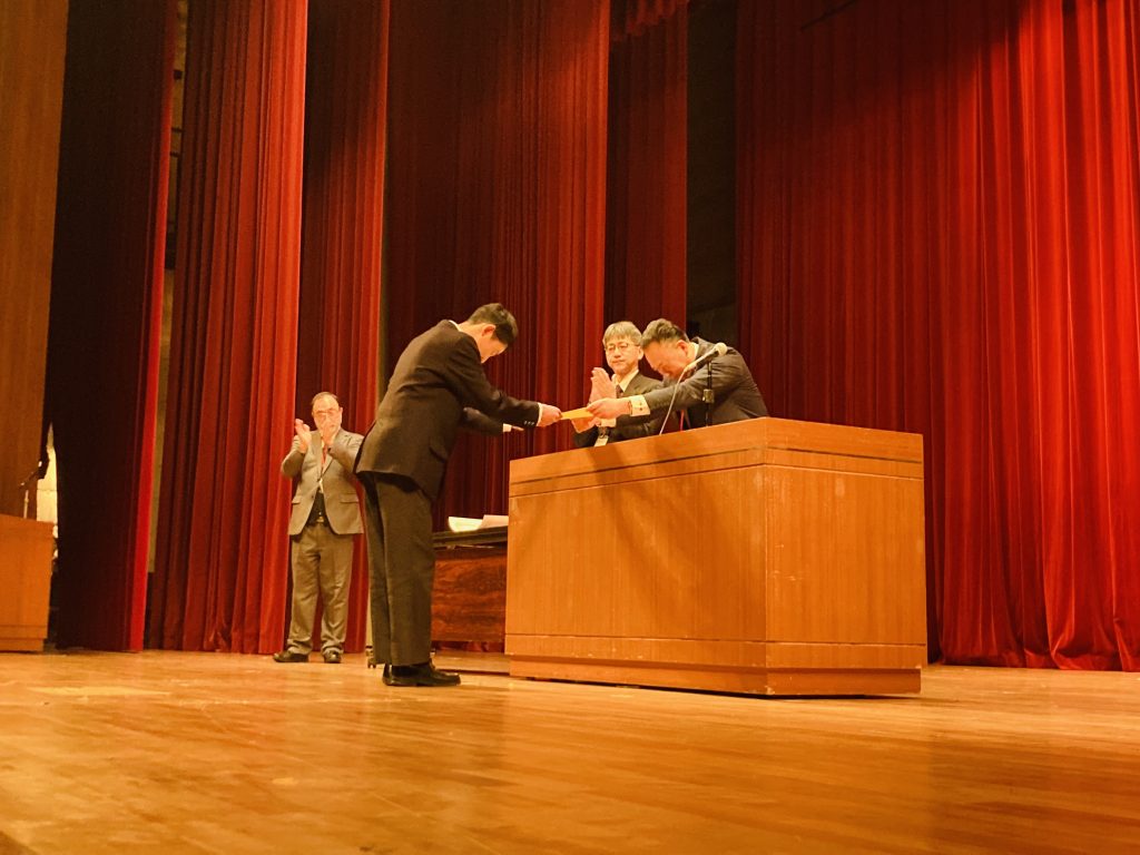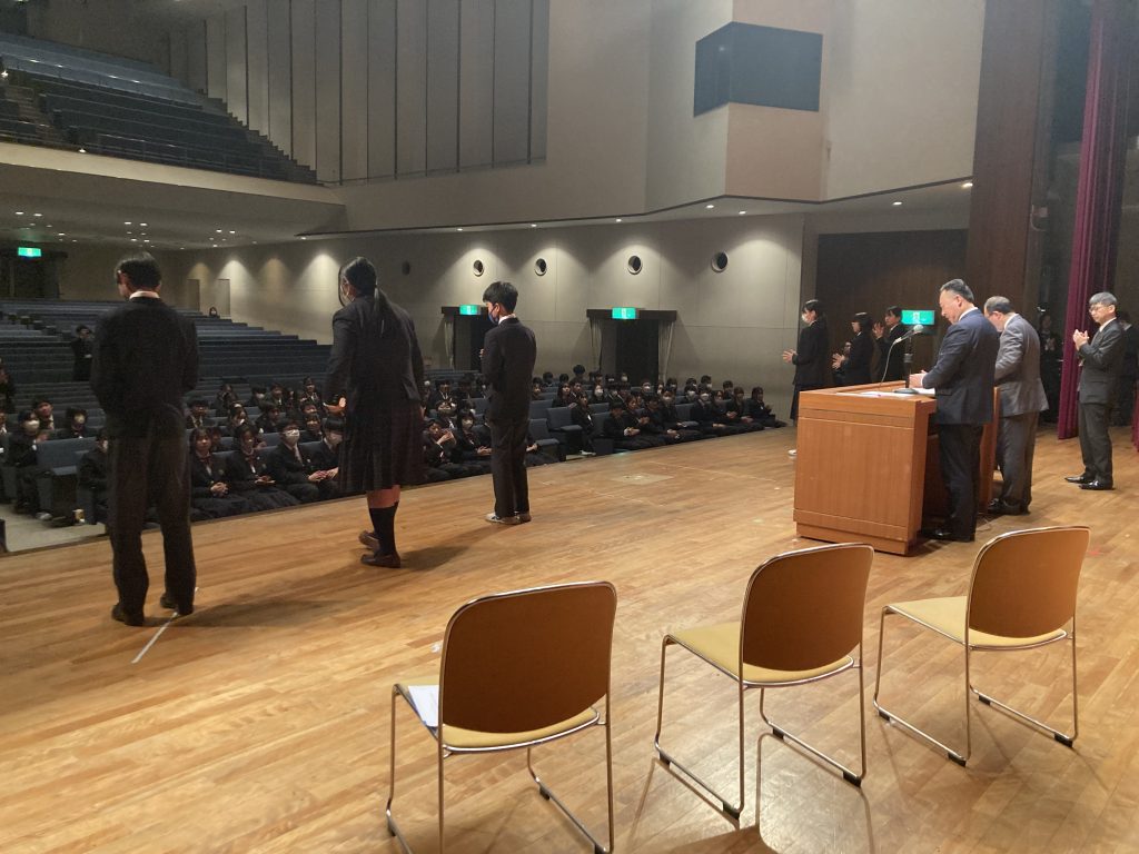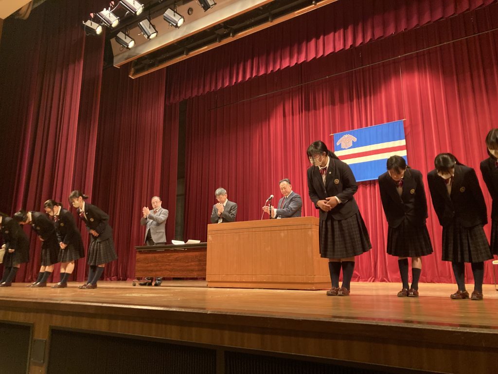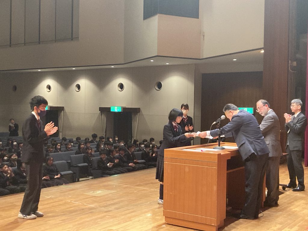 表彰では、大会で活躍したバレーボール部、EXPO作文コンクールで入選した中2の神保さん、JICA国際協力エッセイコンテストで入賞した中1の秦さんが表彰されました。