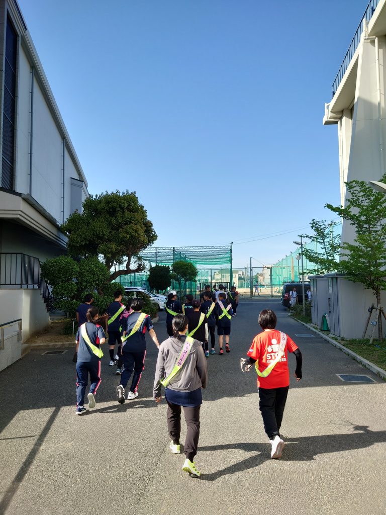 本校では、2018年に女子テニス部が高石警察署が協力して始めた活動ですが、その後陸上部も加わり、地域の見守り活動を展開してきました。