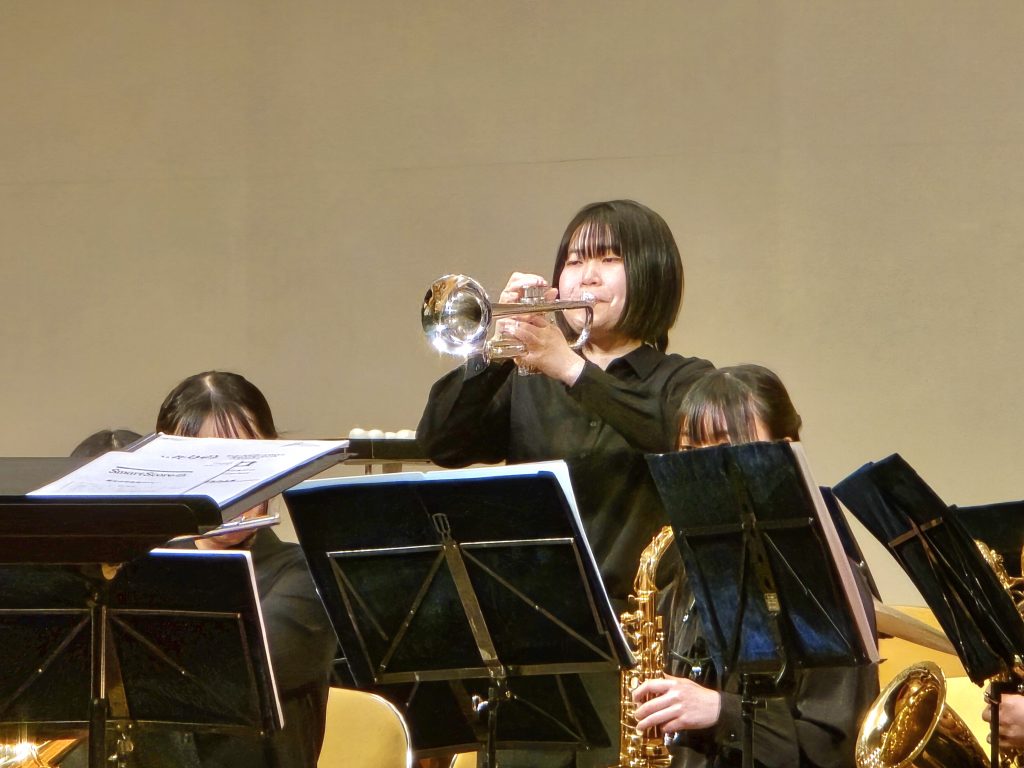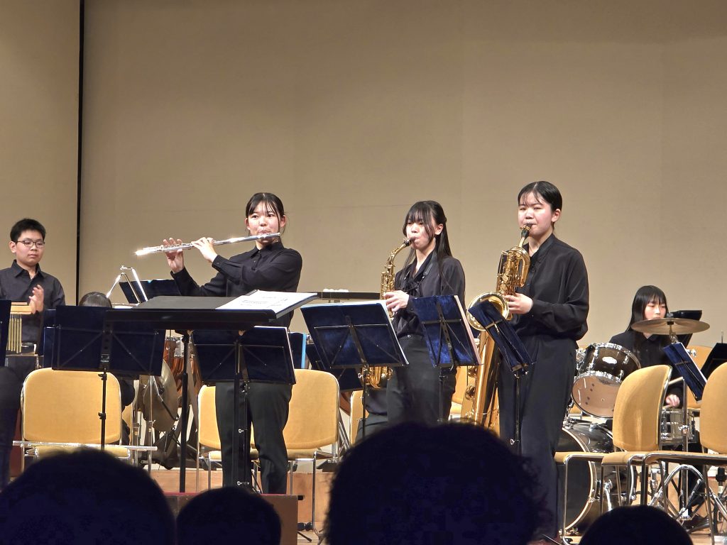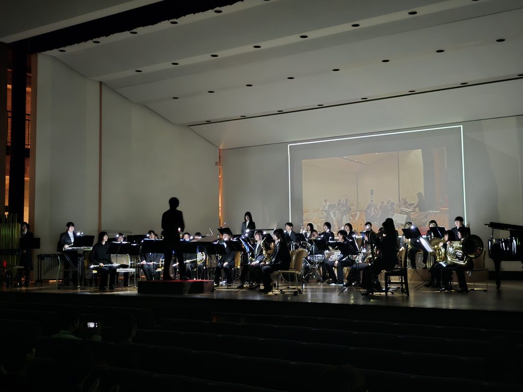 【ダンスホール】【おジャ魔女ドレミカーニバル】【魔女の宅急便メドレー】など、聴き馴染みある作品を演出やスポットライトなど使って、目で見て耳で楽しむステージとなりました。そして演奏会のフィナーレは、卒業生、そしてこの春入学した新高校1年生を交えたスペシャルバンドで演奏しました。曲は【となりのトトロ コンサートバンドのためのセレクション】です。アニメーション映画『となりのトトロ』の劇中で流れている曲をメドレーにした作品で、ラストまでノンストップで駆け上がる演奏なり、演奏後には大きな拍手をいただきました。