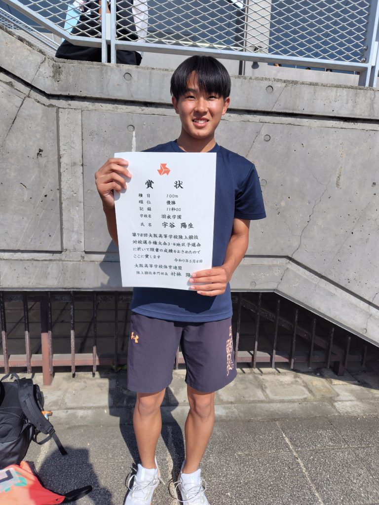 続く5月4・5日のインターハイ地区予選では、宇谷選手が男子100mで優勝!地区予選を突破し、中央大会進出です! タイムは11″00(向かい風0.9m)でした!