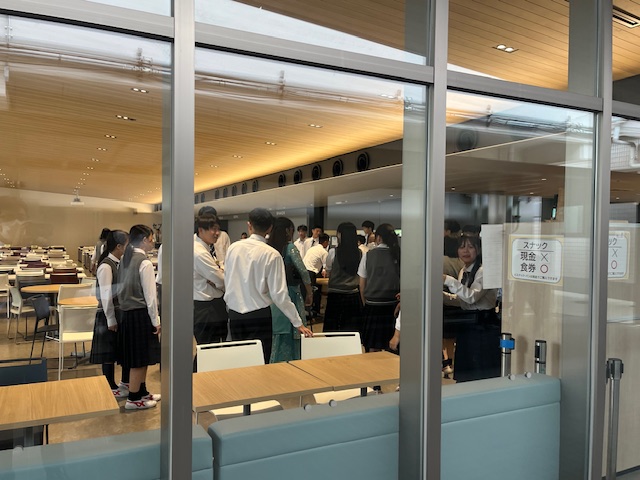 各クラス6~7名の班に分かれて、一名の相手校の生徒を伴って校内の各所を案内しまがら、それぞれ交流しました。