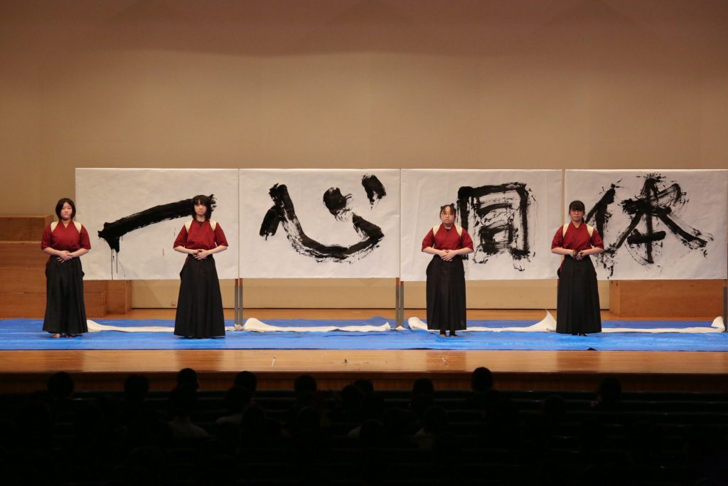 書道部は初めての参加でした。音に合わせ、全身を使ってのパフォーマンスは素晴らしく、「一心同体」の文字が完成した時、講堂にいる皆が同じ気持ちを感じたことと思います。