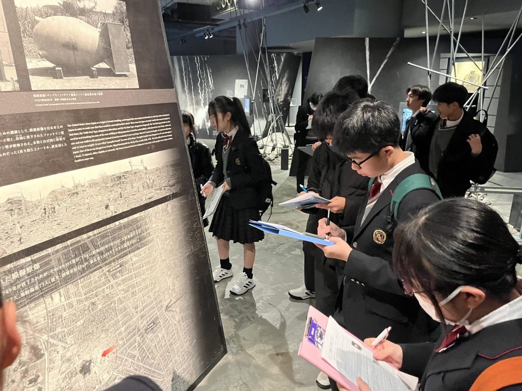 学園では長年にわたり中学2年生で、大阪城公園内にある平和資料館「ピースおおさか」を訪問しています。これは人権学習の一環の社会見学で、戦争・平和について学んでいます。今年度は12月16日に施設を訪問しました。
