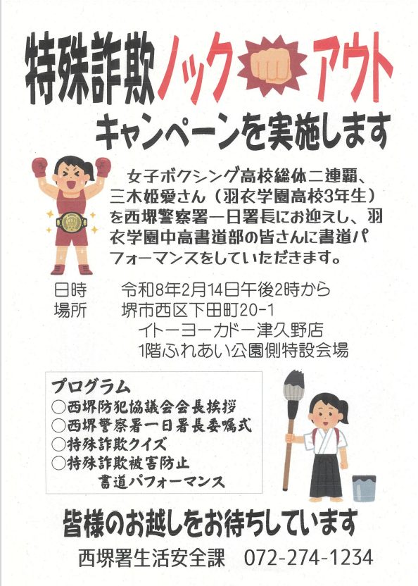 2月14日(土)14時から、イトーヨーカドー津久野店にて、西堺警察署主催の『特殊詐欺ノックアウトキャンペーン』が行われます。このイベントに本校3年生で女子ボクシング・インターハイ2連覇を果たした三木さんが、「一日警察署長」に委嘱され、このキャンペーンに協力します!