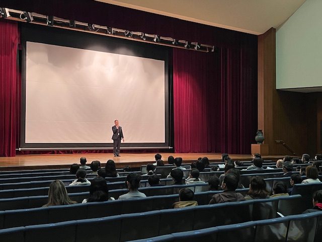 小山教頭からは、現在までの大学進学状況のトピックや、学校の取り組みについての説明があり、その後は少人数グループに分かれて校内見学をしていただきました。