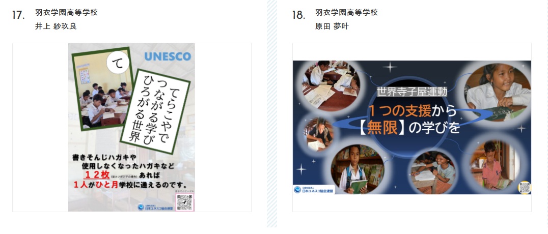 今回、高校2年生400名の作品の中から、校内で選出された2点を応募した結果、井上さんの作品が奨励賞、同じく原田さんの作品が佳作に選ばれました。