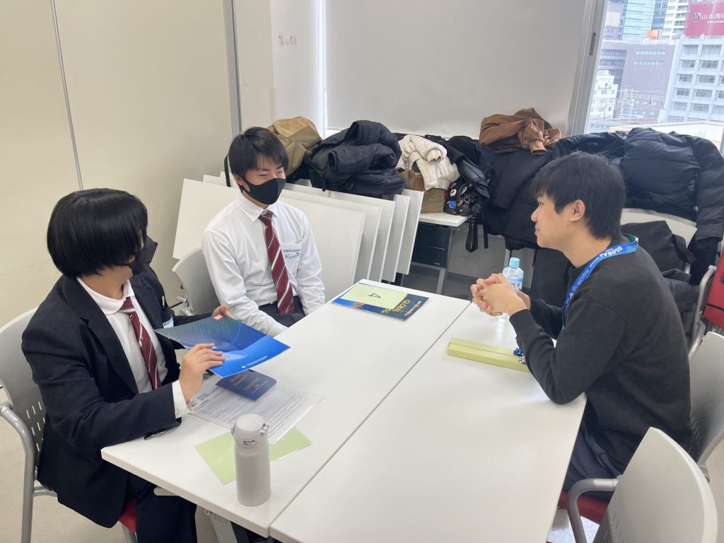 このようなシチュエーションにおいて、英語で対応するプログラムでした。海外への関心を高めるとともに、日々の生活や文化、大阪の魅力などを伝えられるコミュニケーション能力の育成が目標のプログラム。 「失敗を恐れない!」をモットーに、参加した生徒たちはそれぞれ楽しく英語でのコミュニケーションにチャレンジしていました♪