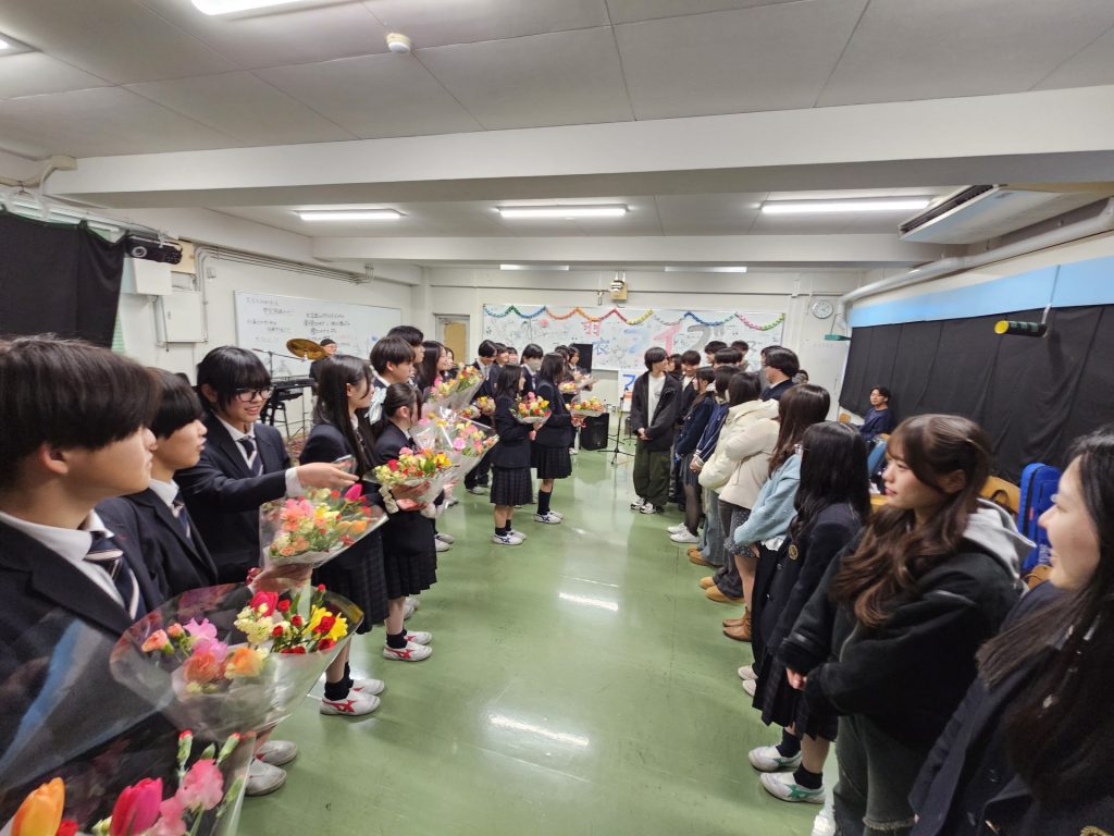 ライブ終了後には、部室にて在校生から卒業生へ花束の贈呈を行い、最後の交流会で卒業生の門出を祝いました。