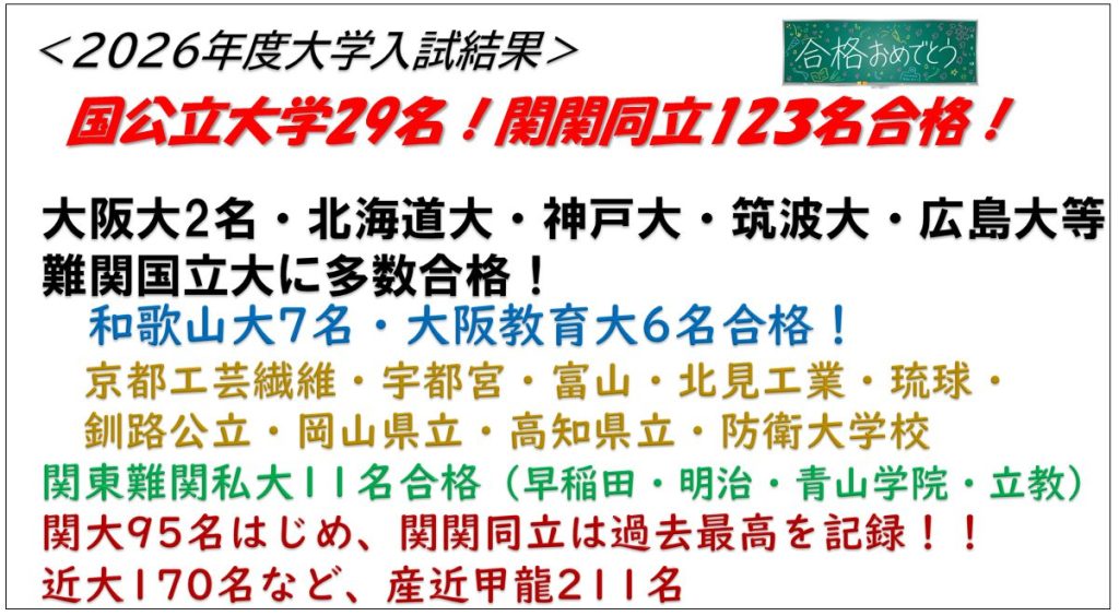 2026大学入試において、卒業生たちの努力が実り、国公立大学29名、関関同立123名がそれぞれ現役合格と、過去最高の合格数を記録!3月16日には、先日卒業したⅠ類コースの生徒たちが一堂に会して「大学合格を祝う会」を実施し、それぞれの合格報告を行いました!