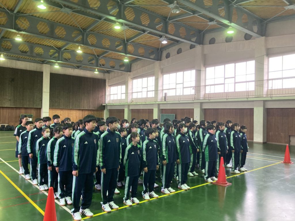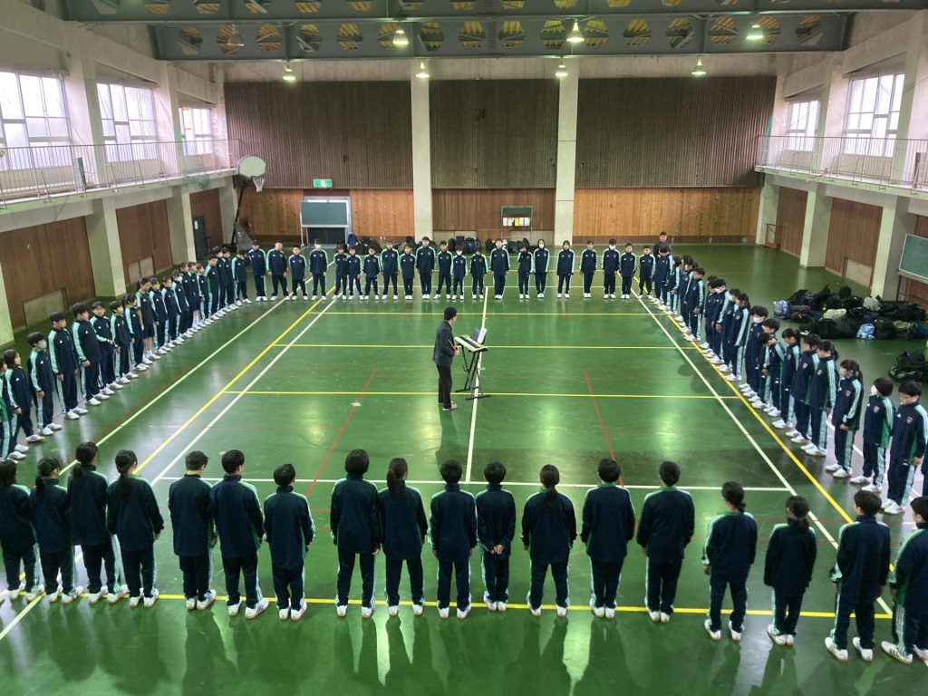 翌朝はあいにくの雨☂ 朝の集いは体育館内で校歌の練習とオリエンテーリングの結果発表を行いました。