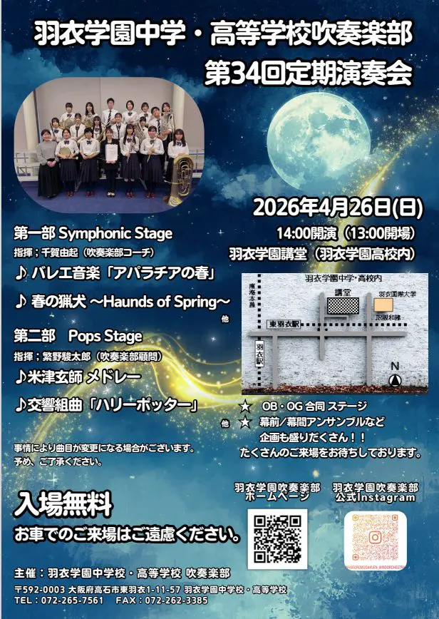 音楽だけでなく、目で楽しむ演出もあるプログラムをご用意しておりますので、4月26日(日)は、羽衣学園講堂にぜひお越しください。