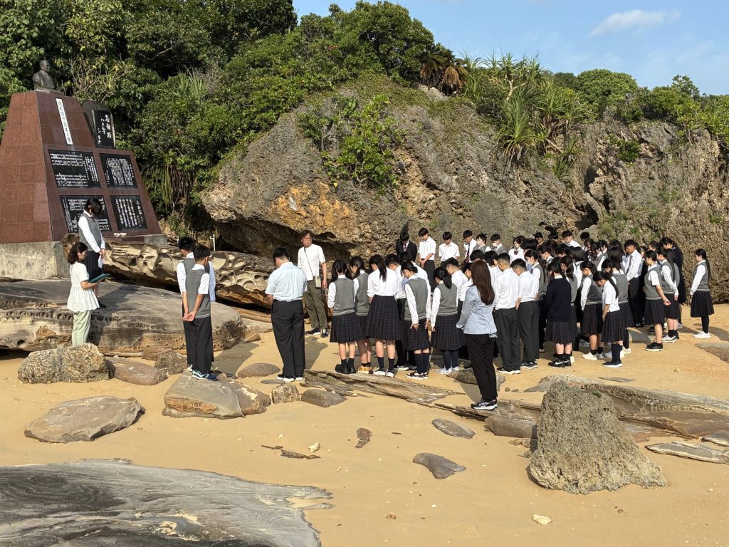 当時波照間小学校のこどもたちも西表島に疎開させられ、西表島で多くの子どもたちがマラリアでなくなりました。小学校の識名校長は、波照間島をのぞむ「南風見田(はえみだ)」の浜の石に、「忘勿石 識名」と刻み、この悲劇を後世に残そうとしました。羽衣学園では、西表島への修学旅行では必ずこの「忘勿石」を訪ね、平和を誓うセレモニーを続けています。今回も、事前学習で学び、また現地で学んだことを胸に、セレモニーを行い、黙とうを捧げました。
