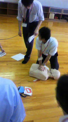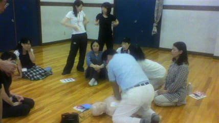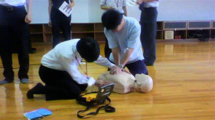 指導員の方から、助けの呼び方、人工呼吸の仕方、胸部圧迫法、AEDの使用法