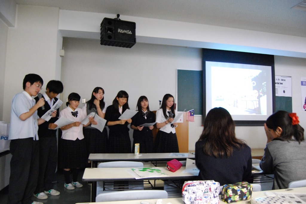 マレーシアの先生・高気宇性代表があいさつをされたあと、本校ボランティア部の2年生が、学校紹介を英語でおこない、 3年生が日本文化・大阪をこれも英語で紹介しました。