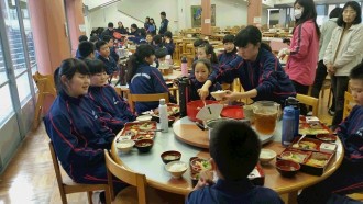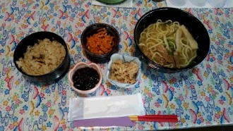 中学3年生の生徒たちは、無事に石垣島空港に到着。お昼には、ソーキそば御膳を美味しくいただきました。